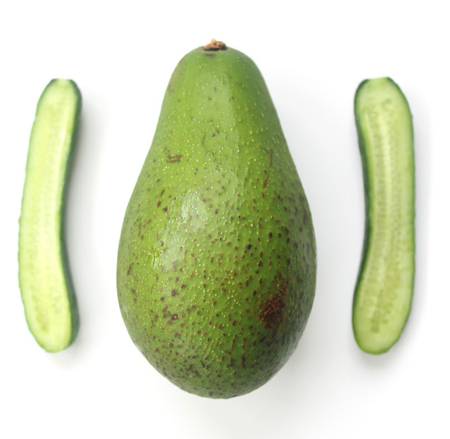 Start by peeling the avocado, and cut it into big chunks next. Cut the cucumbers as well.