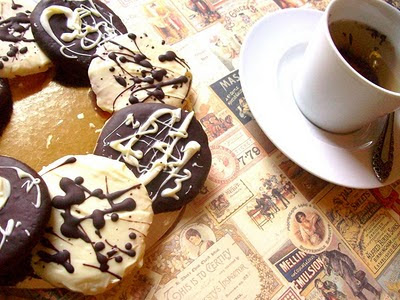 Por fim, decorar as bolachas brancas com o restante chocolate negro e vice-versa!
